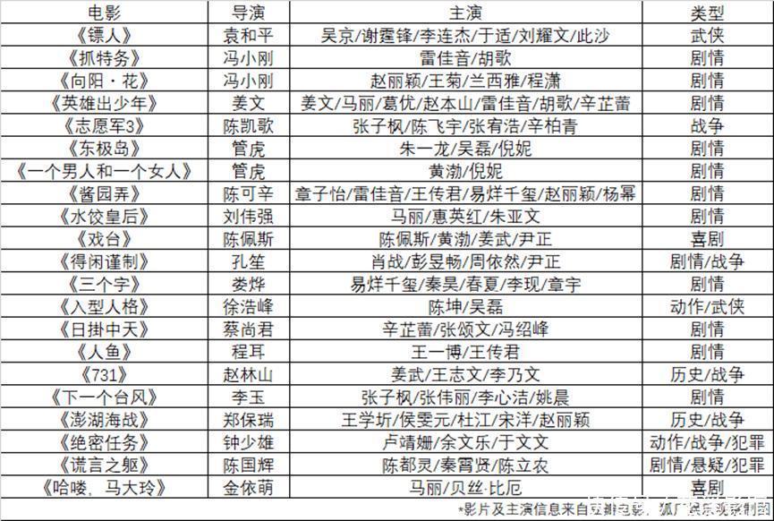 老一代及中生代导演中,袁和平的《镖东说念主》、冯小刚的《捏密探》《晨曦·花》、姜文的《豪超过少年》、陈凯歌的《志愿军3》、管虎的《东极岛》、陈可辛的《酱园弄》、刘伟强的《水饺皇后》、蔡尚君《日掛中天》、赵林山的《731》、程耳的《东说念主鱼》、郑保瑞的《澎湖海战》等都比较受心情。