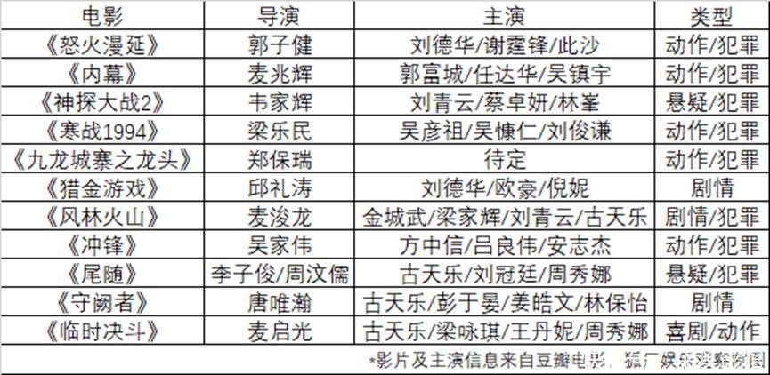 港片主要口角法、四肢片,一经拍完或在筹拍的头部作品有郭子健的《肝火漫延》、麦兆辉的《内幕》、韦家辉的《神探大战2》、梁乐民的《寒颤1994》、郑保瑞的《九龙城寨之龙头》、邱礼涛的《猎金游戏》、麦浚龙的《风林火山》、古天乐公司的《尾随》《守阙者》等,这些电影都由各人熟知的港星成列组合主演,有一定的基本盘。
