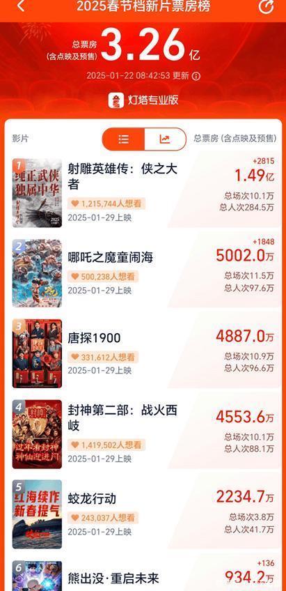 本年春节档,《哪吒之魔童闹海》《唐探1900》《封神第二部:战火西岐》《射雕豪杰传:侠之大者》《熊出没·重启过去》《蛟龙行动》六部电影竞争力都很强,如果上映后口碑都可以,莫得影片显著掉队,最终都有可能插足年度票房榜前哨,六部电影的所有票房也很可能最初客岁四部的112亿元。