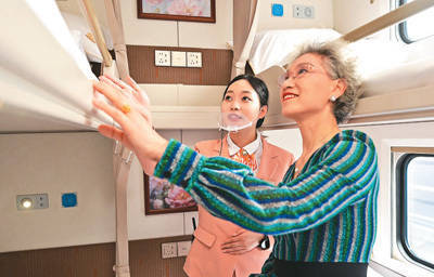 “华夏铁说念·大河之南号”特质旅游列车全列遴选适老化假想,配备夜光扶手、进军呼唤安设和医疗职业专区,将为银发族旅游出行打造酣畅、便利、安全的搭车体验。 图为河南省郑州市,列车管家正在为试乘搭客讲明软卧包厢的适老化假想细节。 王 玮摄(东说念主民视觉)