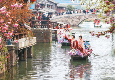 千里浸式古镇游 在浙江省湖州市德清县新市古镇举行的蚕花庙会上,“蚕花娘娘”在船上向游客和蚕农撒蚕花。 姚海翔摄(东说念主民视觉)