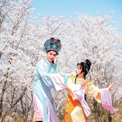 安徽省宣城市郎溪县十字镇新和村鼎力发展“樱花经济”,开荒出樱花糕、樱花伞、樱花雪柜贴等文创居品,并催生出特质市集、文化驿站、村咖等业态。 图为戏曲可爱者正在扮演。 李晓红摄(东说念主民视觉)
