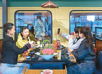 火车餐厅 内蒙古自治区鄂尔多斯市康巴什区将退役火车车厢和客机改建成火车餐厅、飞机餐厅九游体育娱乐网,建立遨游体验空间、自助茶饮空间、自助烤肉空间等多个混搭业态,丰富餐饮破钞场景和居品供给。图为主顾在火车餐厅体验自助烤肉。 王 正摄(东说念主民视觉)