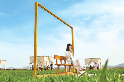 游客在湖北省襄阳市襄城区卧龙镇屠巷村麦田边的“村咖”品咖啡、赏好意思景。 杨 东摄(东说念主民视觉)