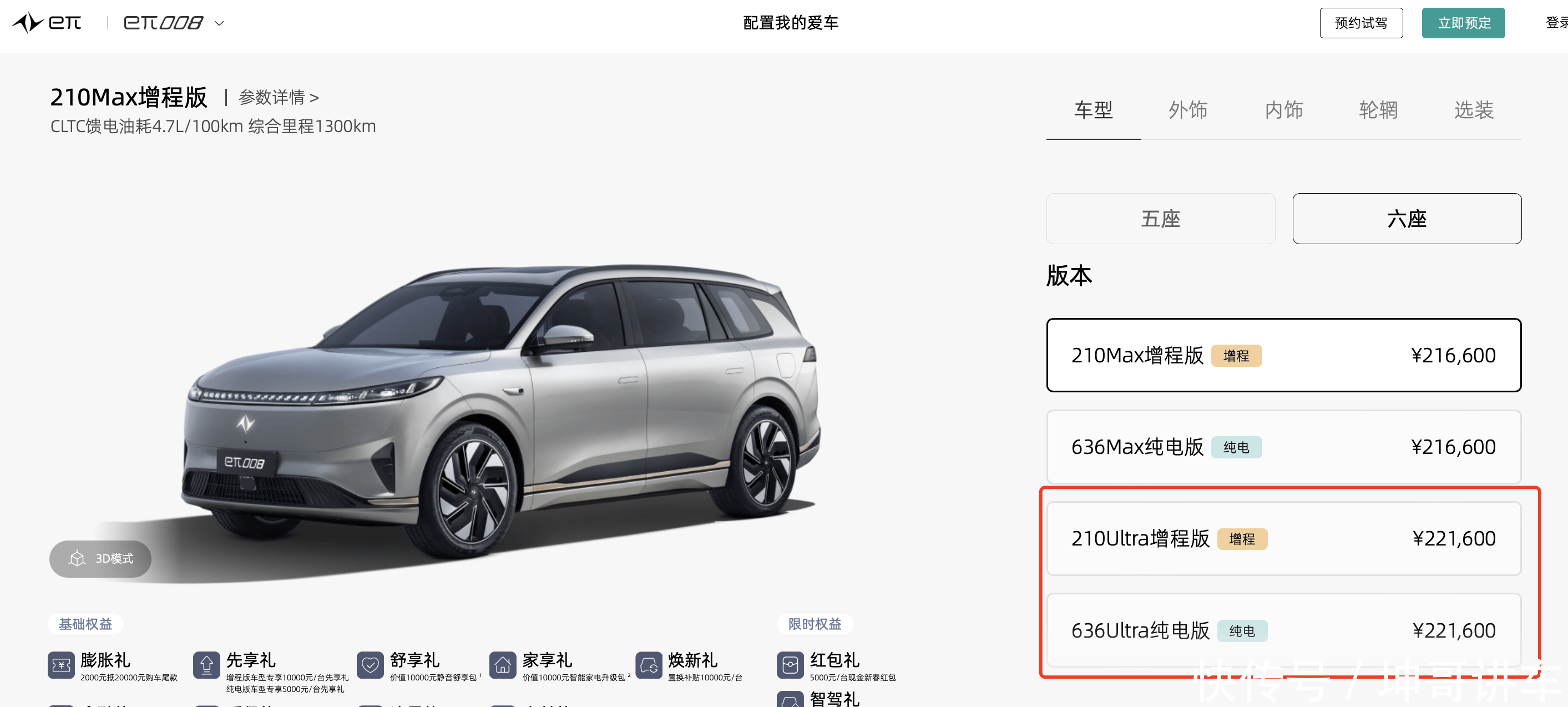 先看外不雅,eπ008 六座 Ultra 版络续了眷属式的科技感打算话语。顽固式前格栅搭配可点亮的合并式灯带,夜晚一亮,辨识度径直拉满,并且灯带下方还藏着星光格栅,能玩出各式酷炫灯语,科技感爆棚。车身侧面线条畅通,荫藏式门把手和悬浮车顶,不仅前锋还裁汰了风阻,21 英寸的大轮辋,理解感透彻。车尾部分,合并式尾灯与车头呼应,车顶扰流板和后保障杠的玄色饰板,增添了档次感,D 柱上的数字韵律充电指引灯,充电时灯光变化,典礼感满满。