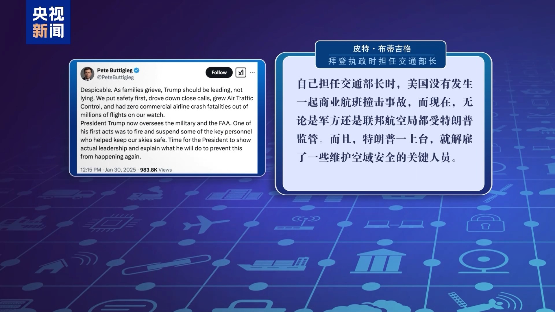 特朗普征引联邦航空局的战术称,联邦航空局在空管东说念主员招聘条款里莫得对生理和心思疾病的规则。对此,拜登在野时担任交通部长的皮特·布蒂吉格赐与否定,说从特朗普首个总统任期运行、即2017年至2021年,关连规则一直都有。布蒂吉格示意,他担任交通部永劫,好意思国莫得发生一皆交易航班撞击事故,而现时,无论是军方如故联邦航空局都受特朗普监管。何况,特朗普一上台,就免除了一些珍摄空域安全的关节东说念主员。