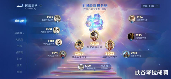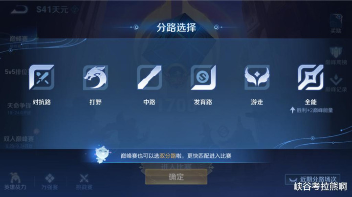 巅峰分路榜还会保留,并将细化为【解放分路模式】,即挣扎路、中路、发育路、游走、打野、万能6个子榜单,跨越1400分即可参与,数据会按照近期50场巅峰赛对局分来统计。若是50场对局中有某个分路场次跨越50%,就会参与该分路排名,若是莫得分路跨越50%,就会按照万能来排名。