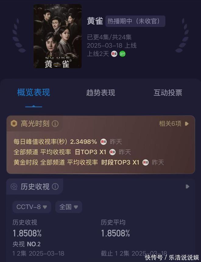 现在,《黄雀》这部剧的热度,已经在央视八套中排在第二名,深受精深不雅众的接待。