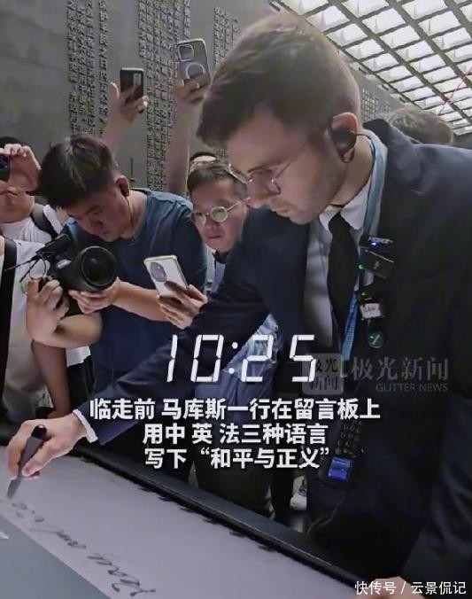 在展馆中,他写下“和平与正义”的传话,将对真相的信守融入此次旅程。