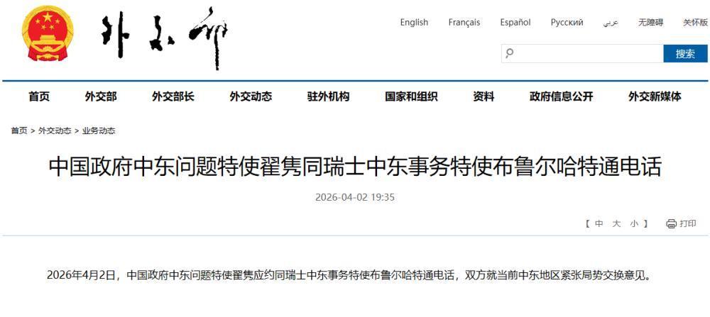 2026年4月2日,中国政府中东问题特使翟隽应约同瑞士中东事务特使布鲁尔哈特通电话,两边就现时中东地区垂危阵势交换看法。